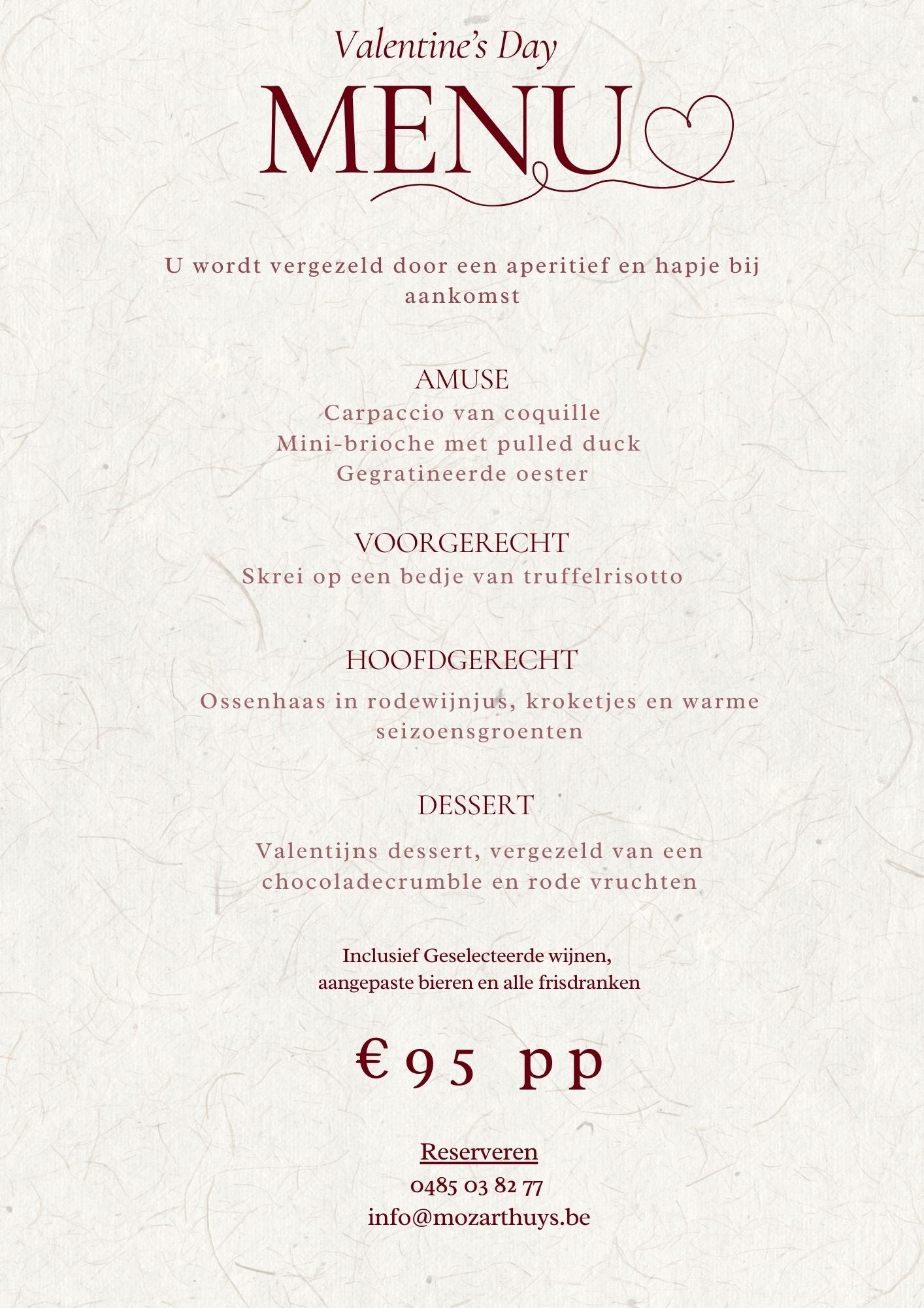 Laat je verwennen met een speciaal Valentijnsmenu, romantische sfeer en een bijzondere verrassing die tussen de gangen door voor een kippenvel moment zorgt.